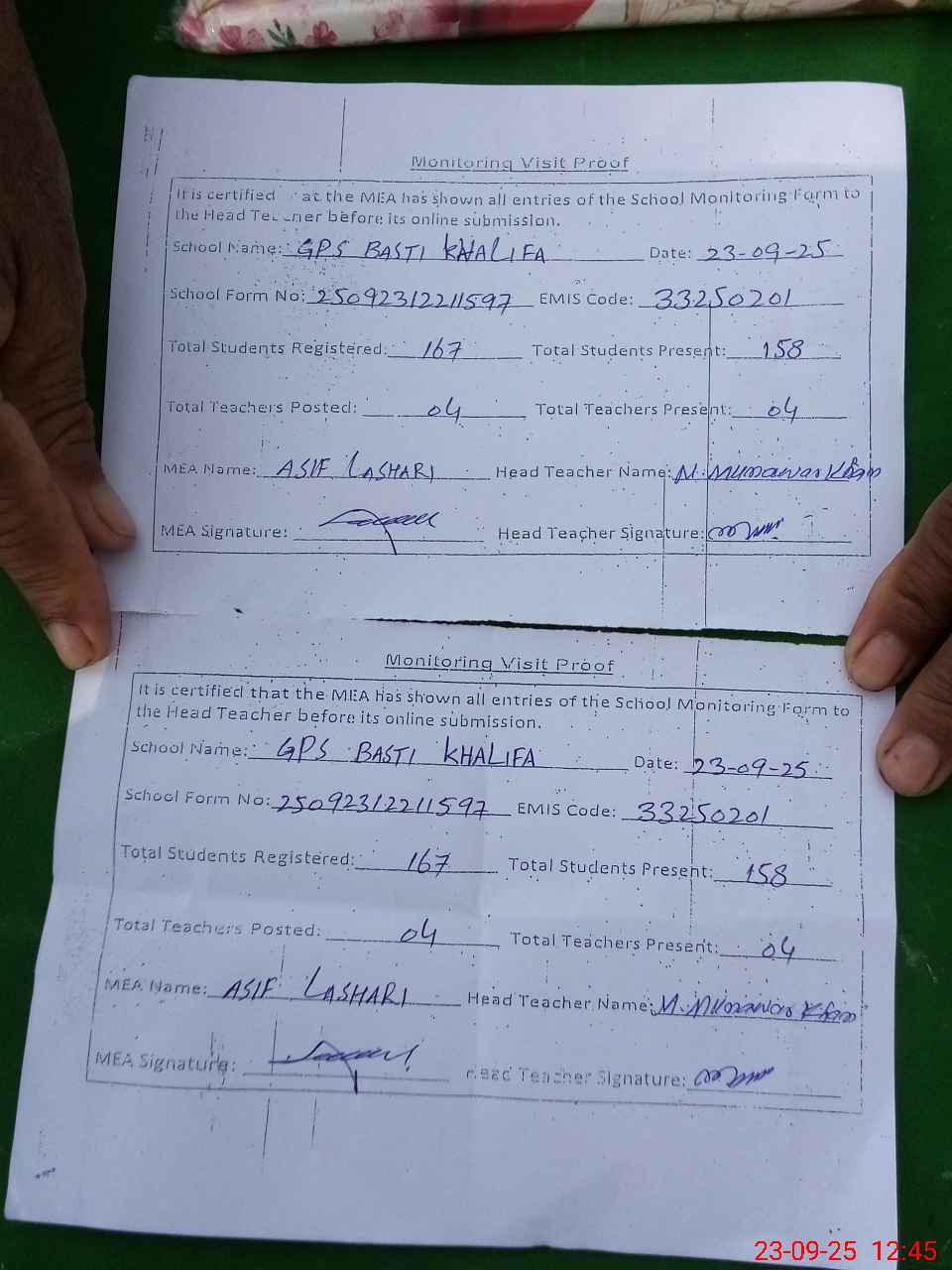 | Attendance Register | Head Teacher | MEA with School | Visit Proof |