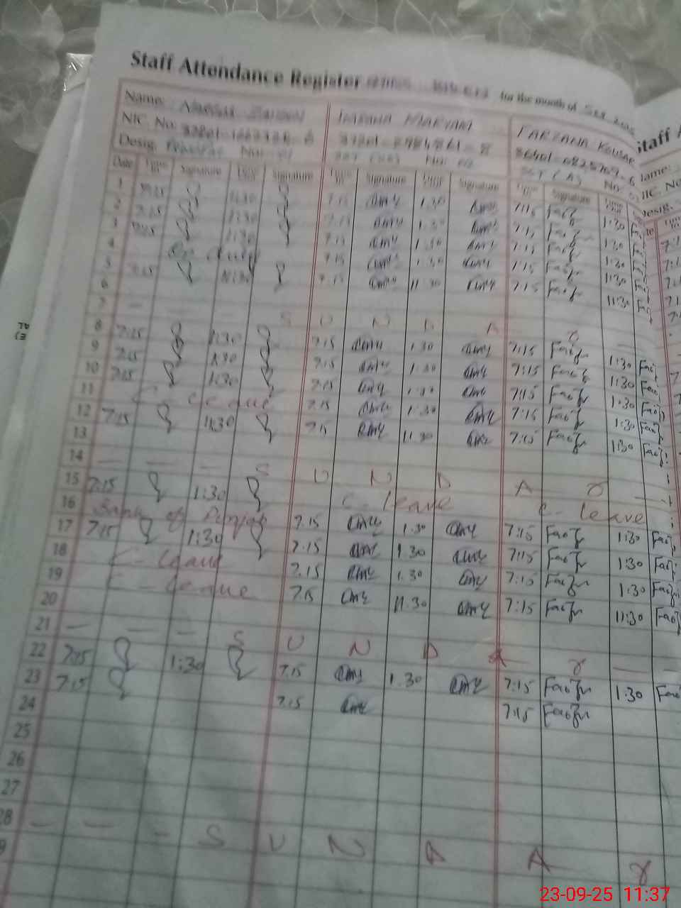 | CNIC | Full Name | Designation | R/C | Absence During Last Calender Month |