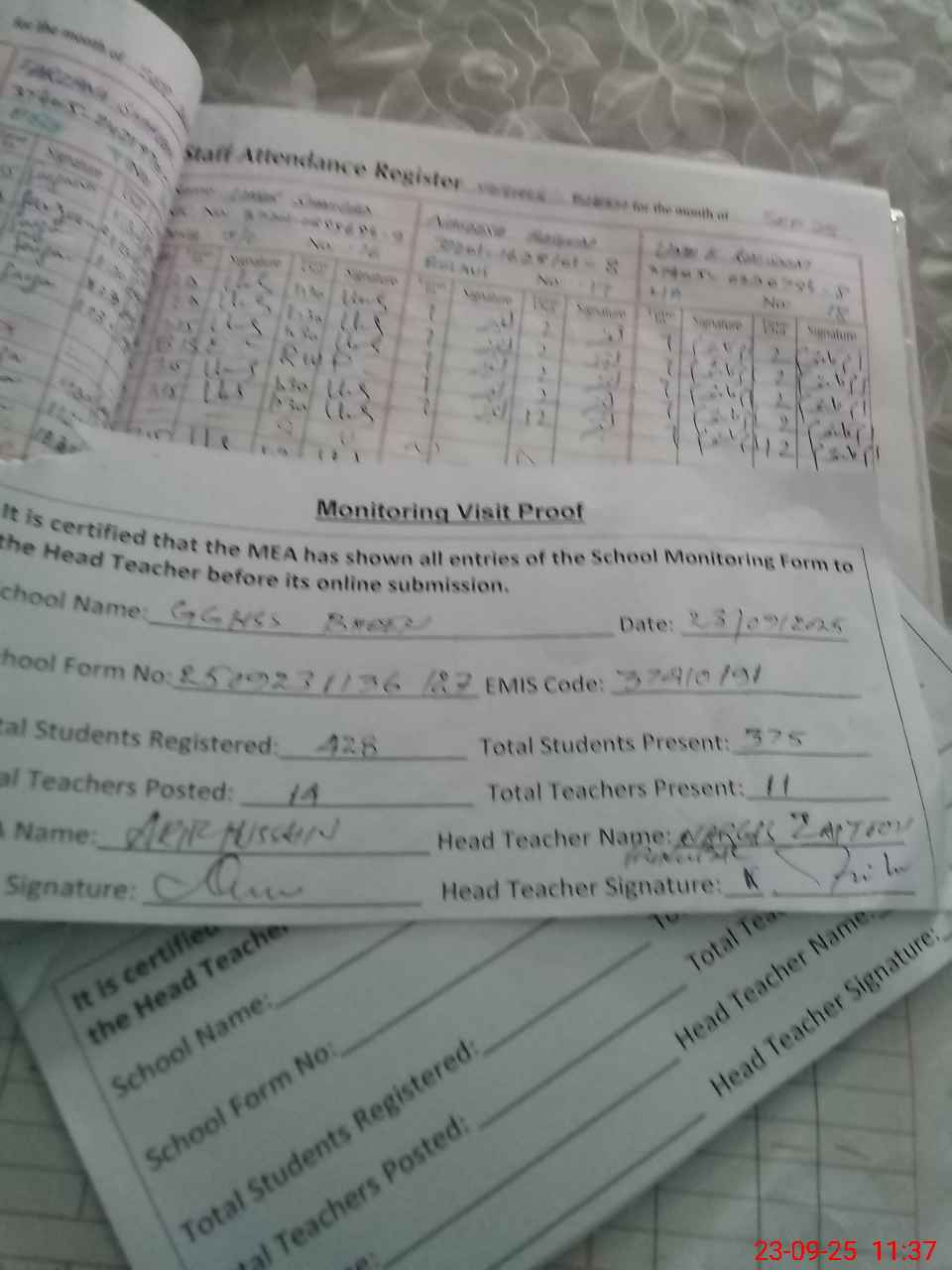 | Attendance Register | Head Teacher | MEA with School | Visit Proof |