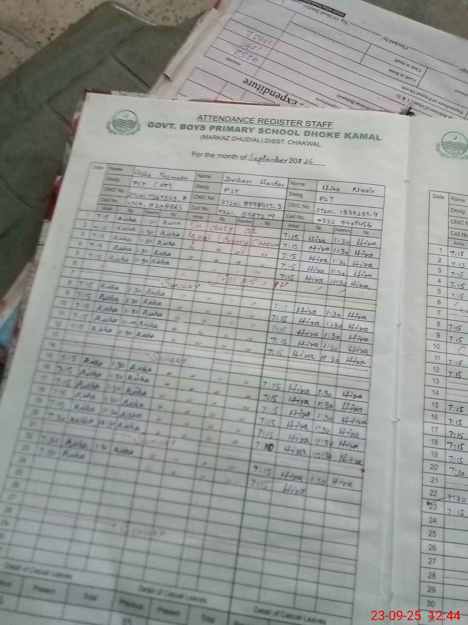 | CNIC | Full Name | Designation | R/C | Absence during last cal. month |