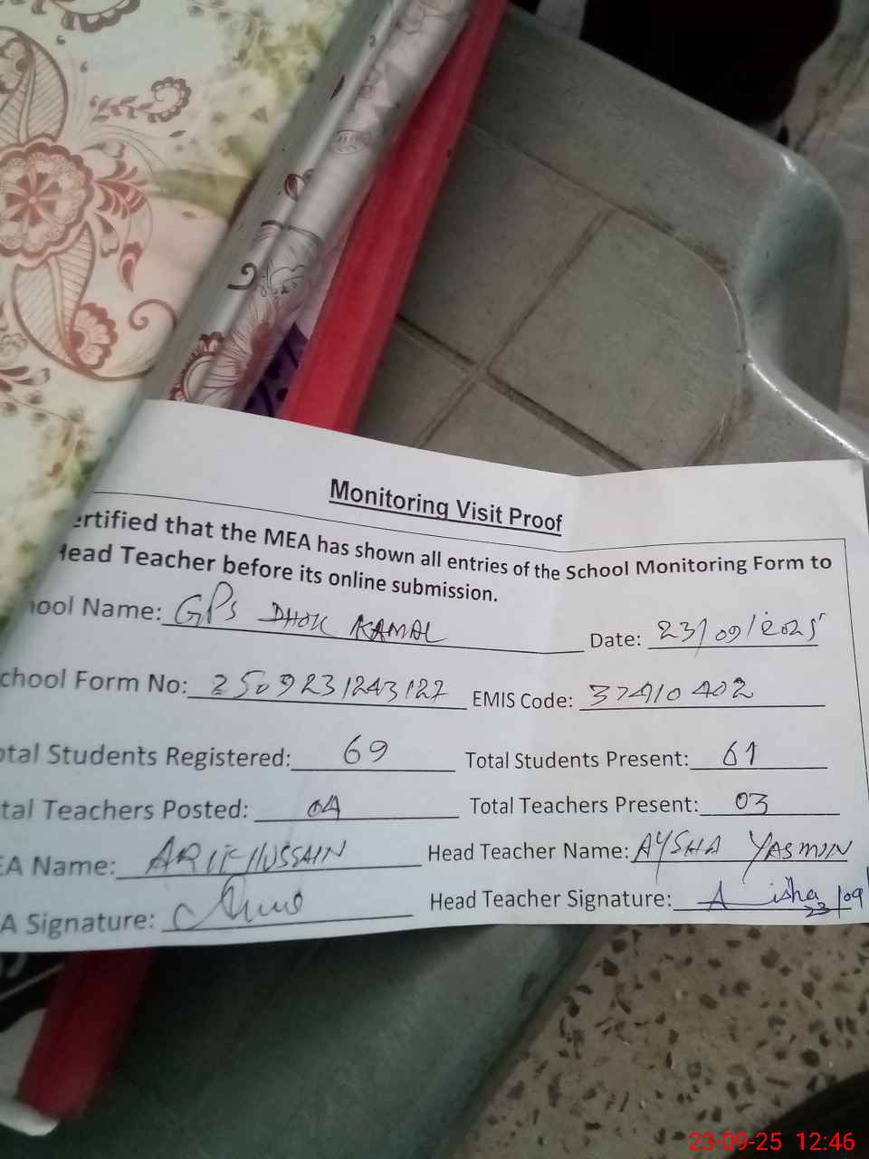 | Attendance Register | Head Teacher | MEA with School | Visit Proof |