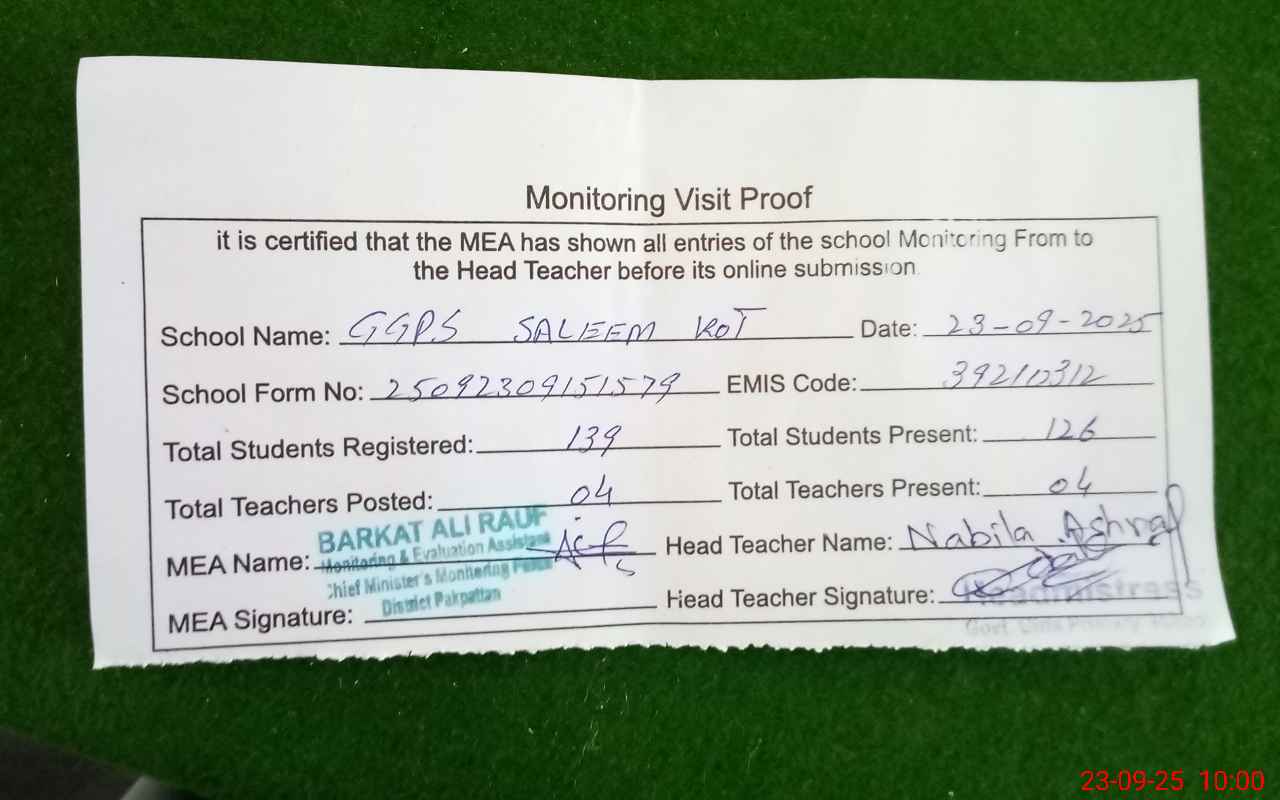 | EMIS Code: 39210312 | Name of School: GGPS SALEEM KOT | |||