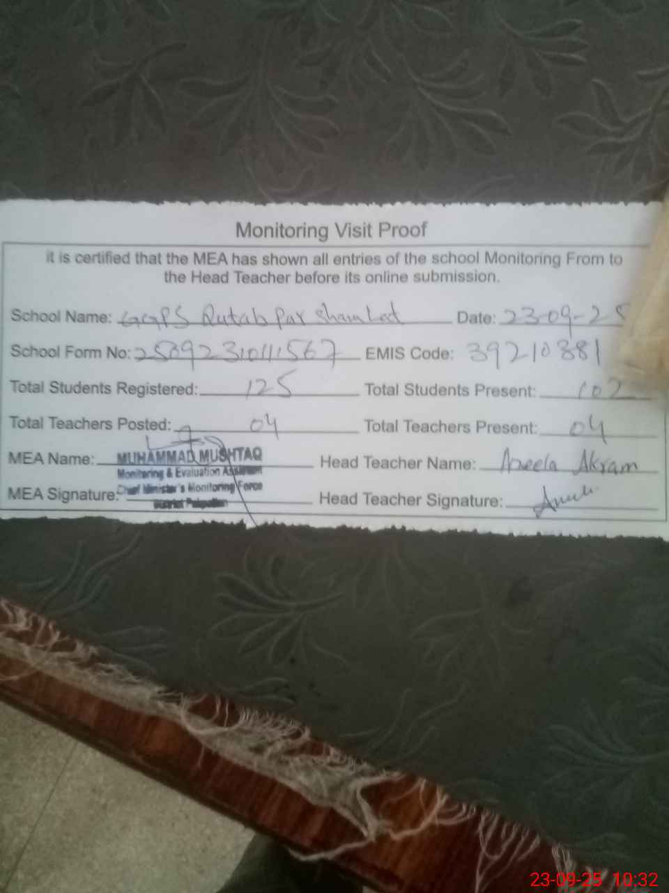 | Attendance Register | Head Teacher | MEA with School | Visit Proof |