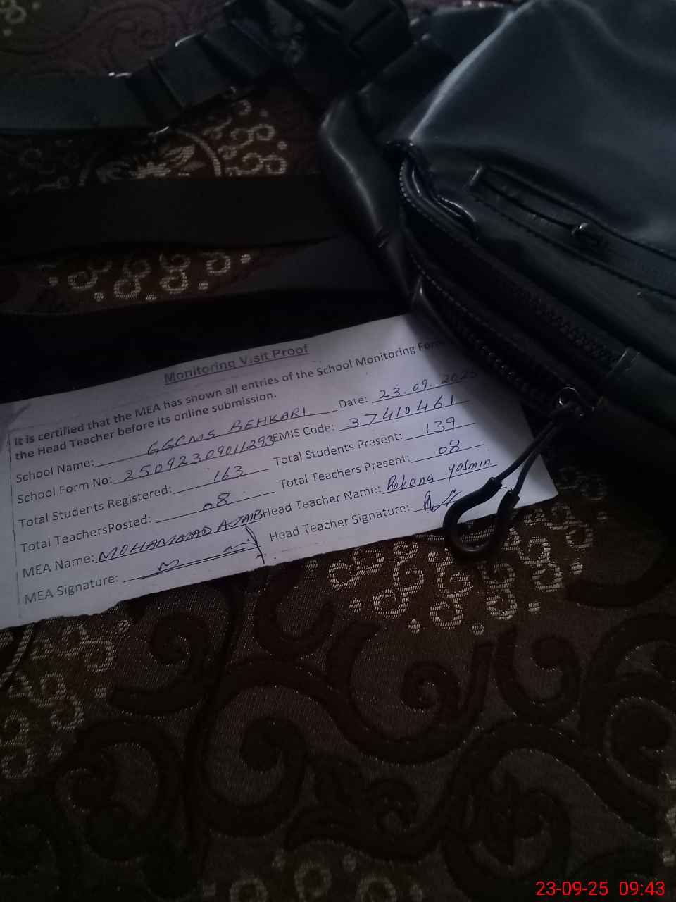 | Attendance Register | Head Teacher | MEA with School | Visit Proof |