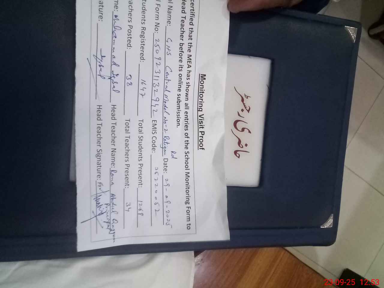 | Attendance Register | Head Teacher | MEA with School | Visit Proof |