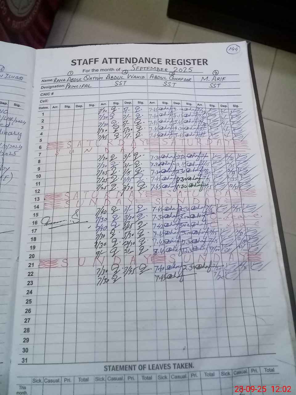 | CNIC | Full Name | Designation | R/C | Absence during last cal. month |