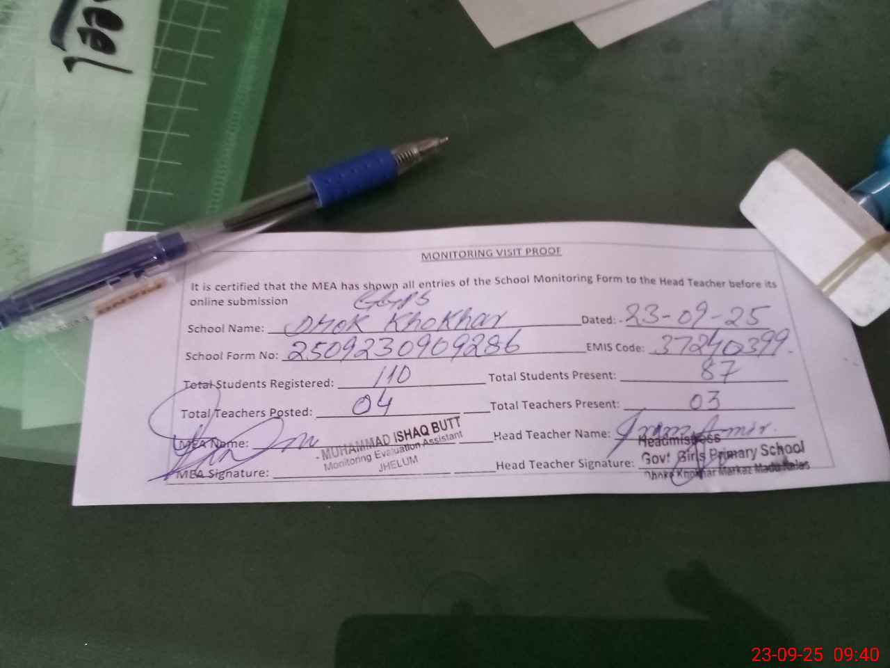 | Attendance Register | Head Teacher | MEA with School | Visit Proof |