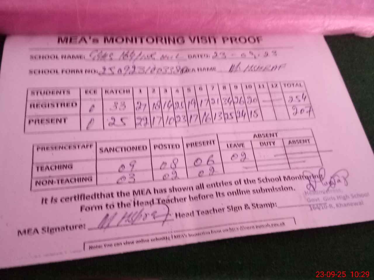 | Attendance Register | Head Teacher | MEA with School | Visit Proof |