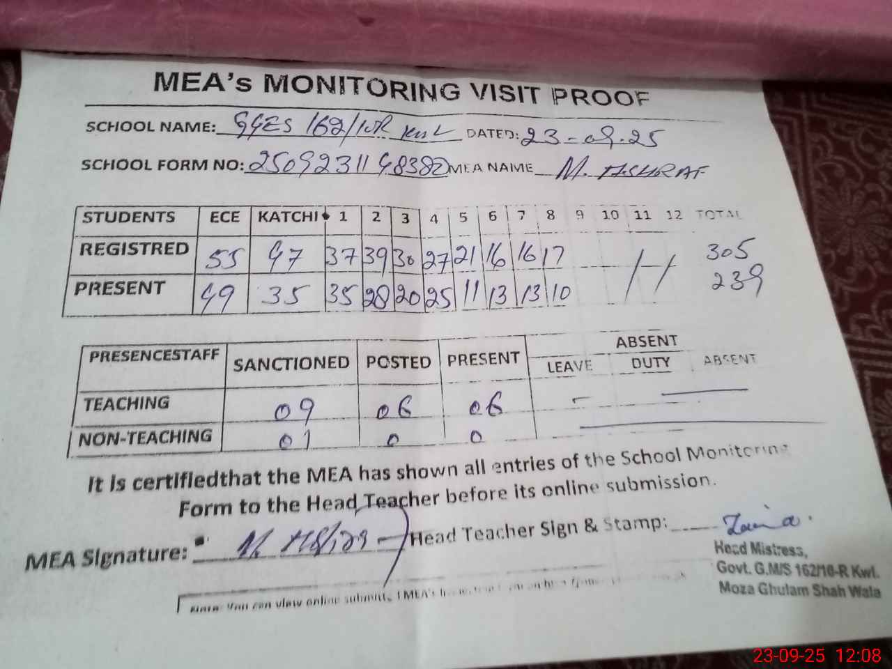 | Attendance Register | Head Teacher | MEA with School | Visit Proof |