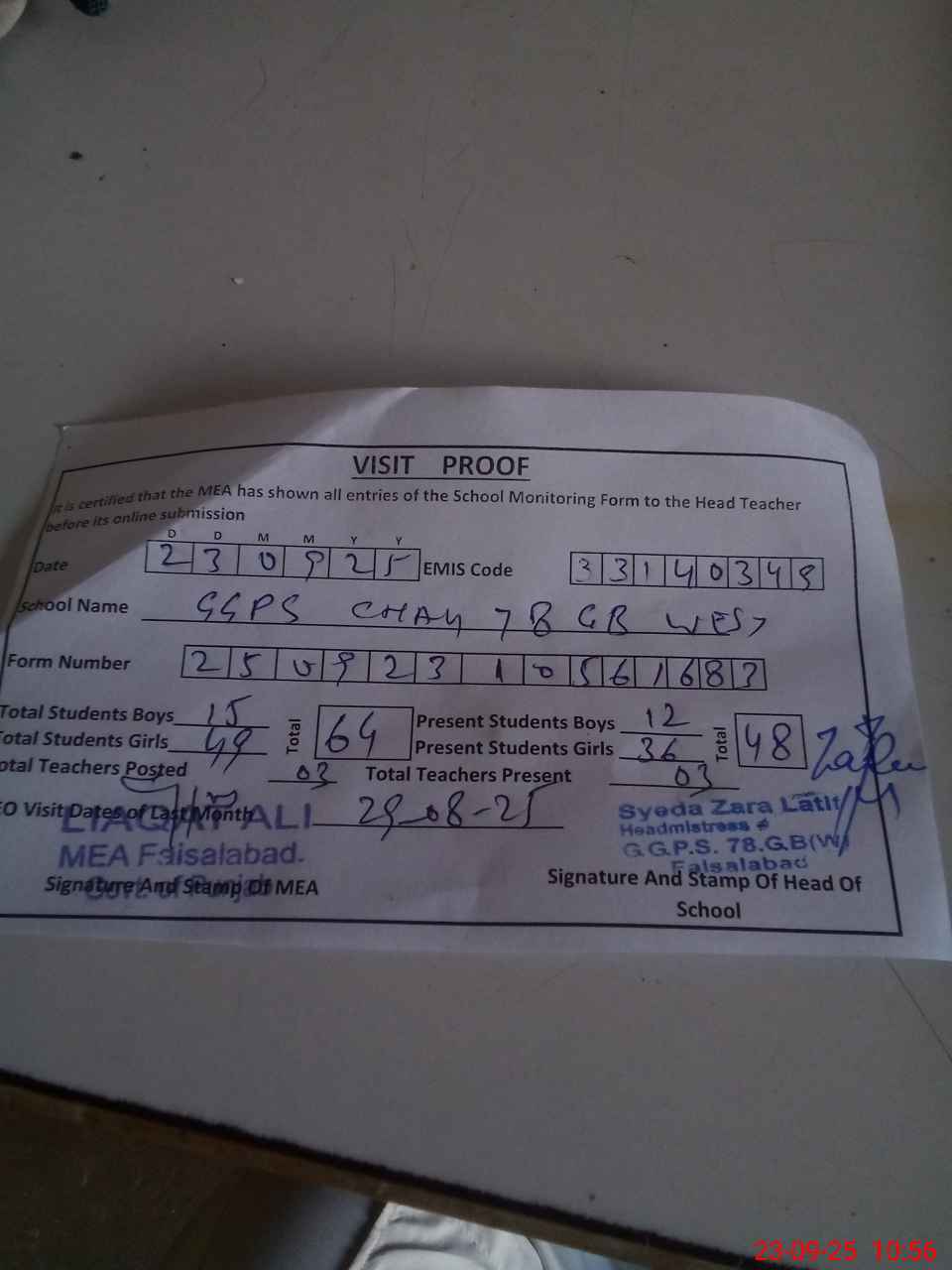| Attendance Register | Head Teacher | MEA with School | Visit Proof |