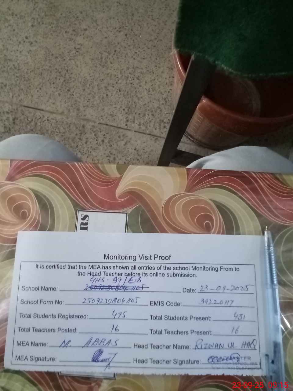 | EMIS Code: 39220117 | Name of School: GHS CHAK NO. 89 EB | |||