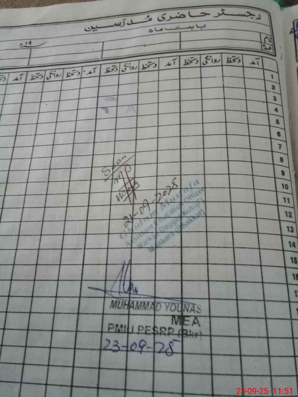 | Name: Uz**** Bi**** Designation: (School Headmaster's/Headmistress's) PST Phone/Cell Number: 03**** |