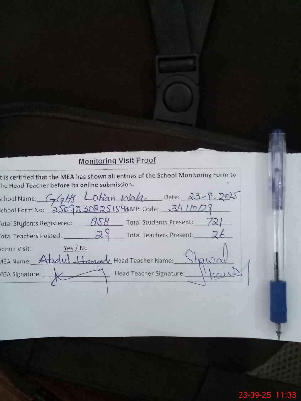 | Attendance Register | Head Teacher | MEA with School | Visit Proof |