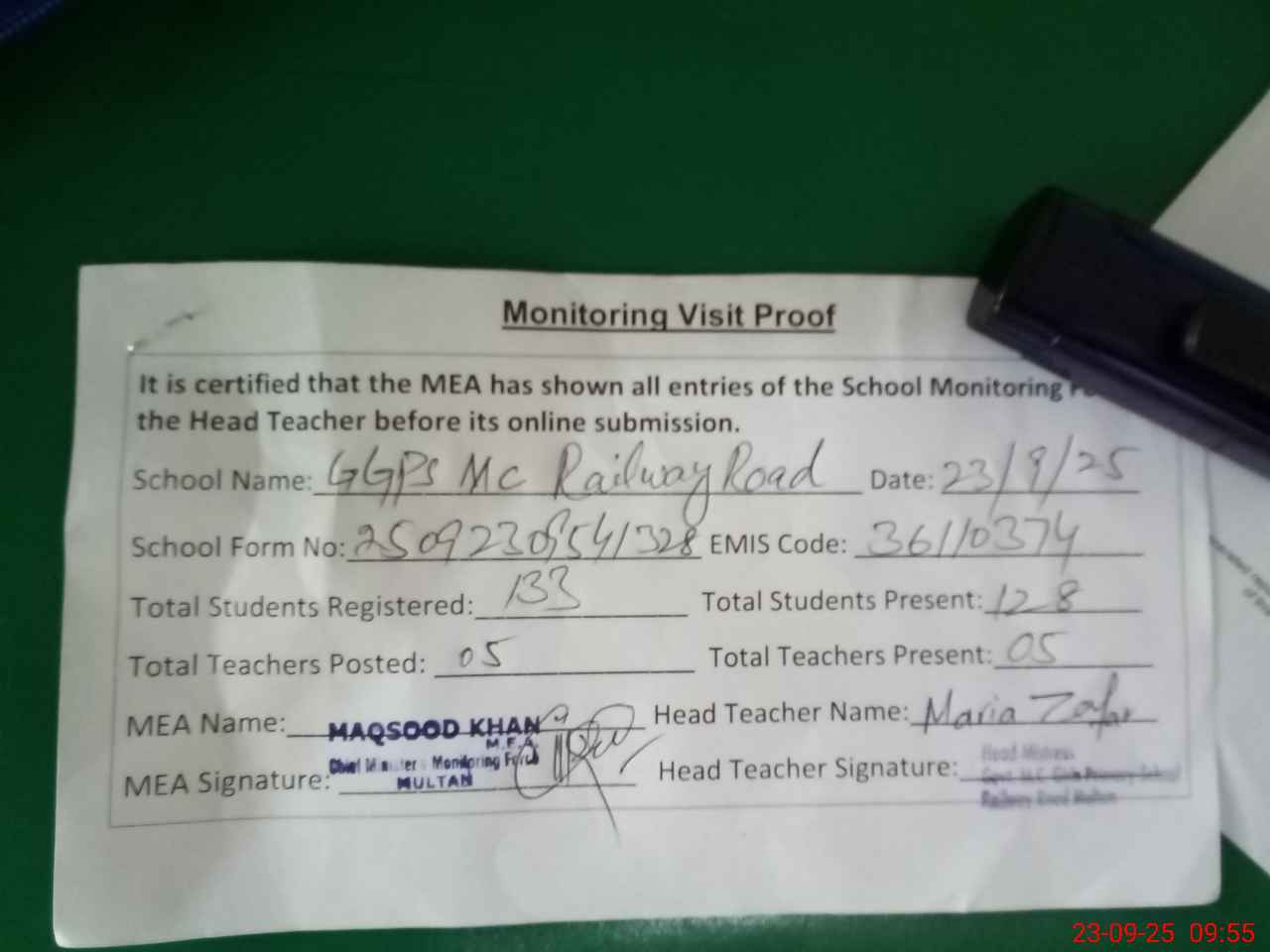 | EMIS Code: 36110374 | Name of School: GGPS MC RIALWAY ROAD MULTAN | |||