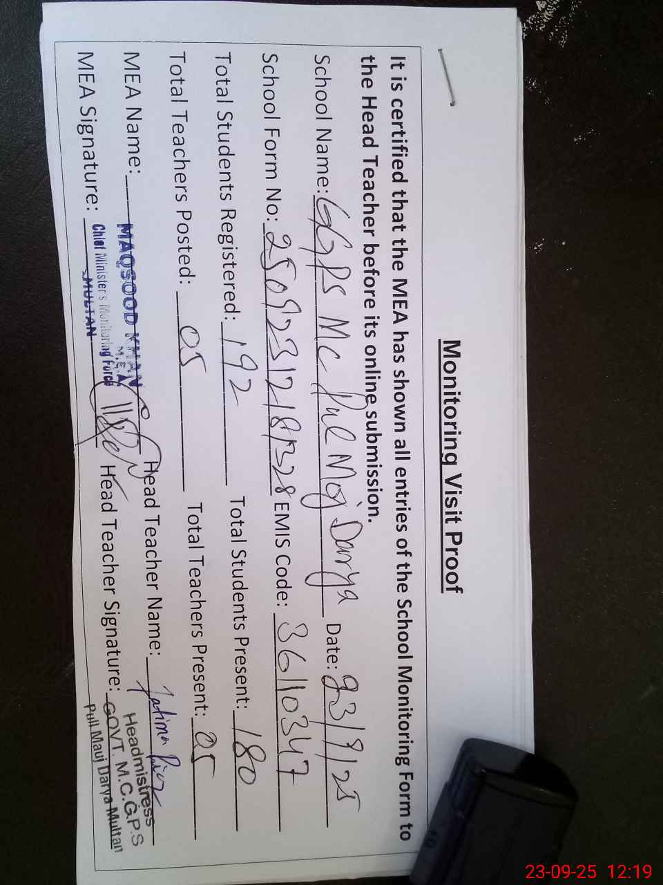 | EMIS Code: 36110347 | Name of School: GGPS MC PUL MOJ DARYA MUHALLAH TARIQ ABAD GALI NO.2 MULTAN | |||