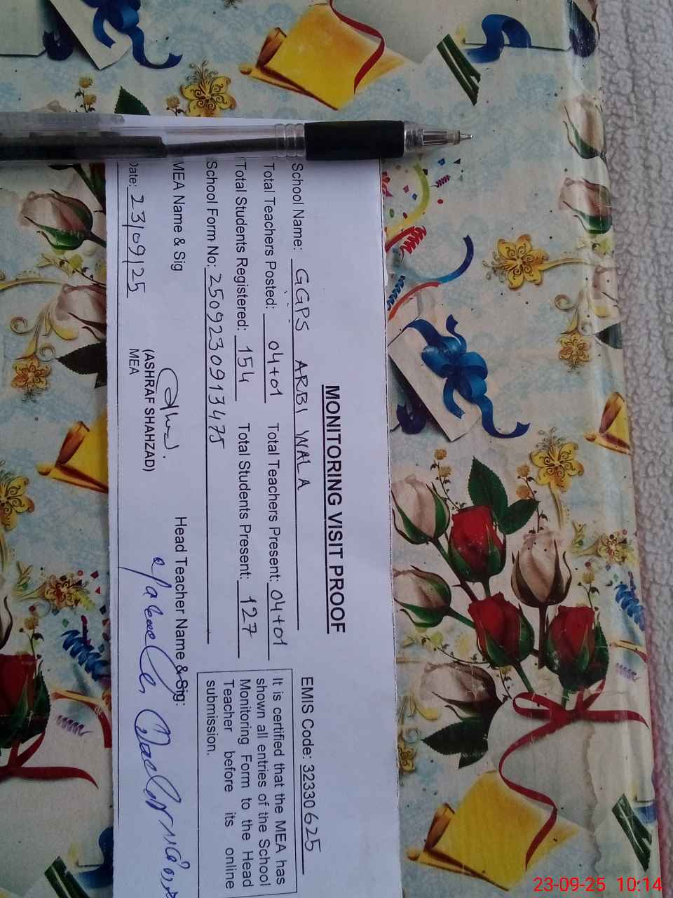 | EMIS Code: 32330625 | Name of School: GGPS ARBI WALA | |||