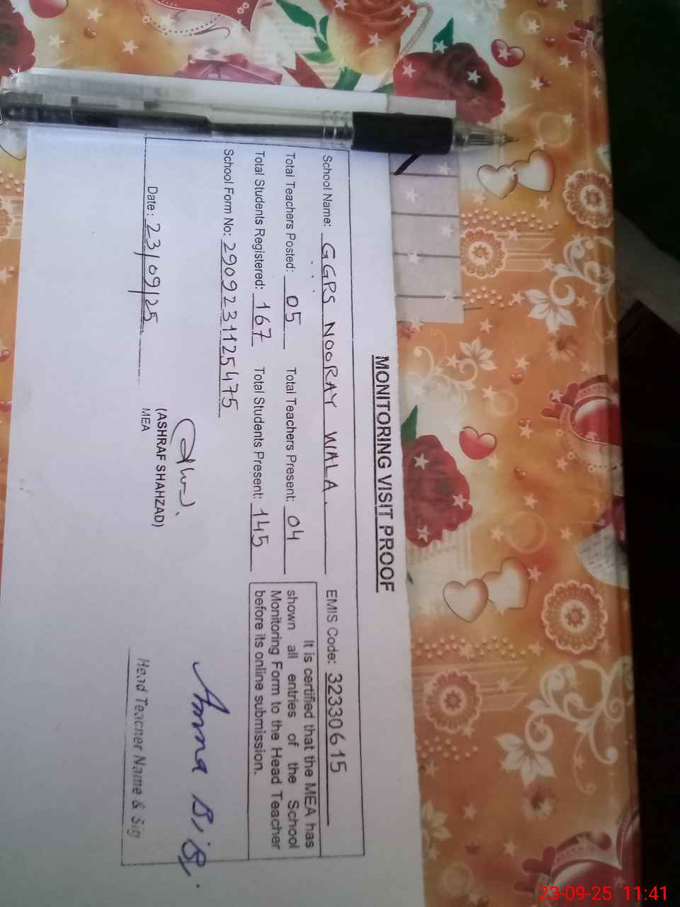 | EMIS Code: 32330615 | Name of School: GGPS NOORAY WALA | |||