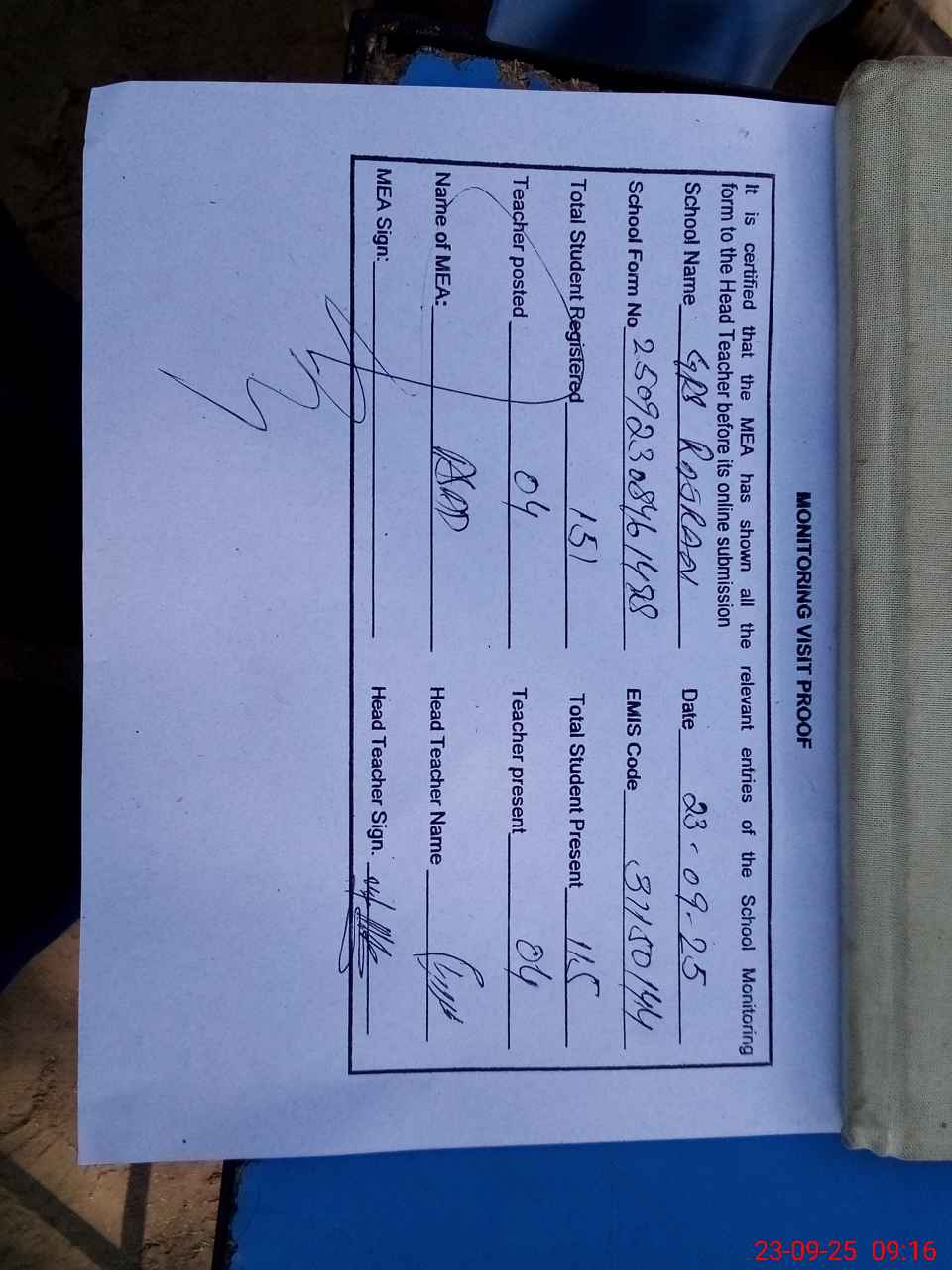 | Attendance Register | Head Teacher | MEA with School | Visit Proof |