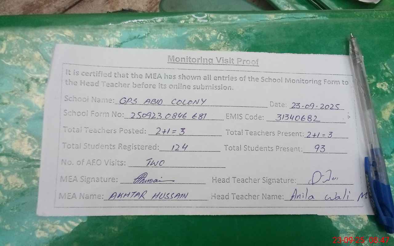 | EMIS Code: 31340682 | Name of School: GPS ABID COLONY | |||
