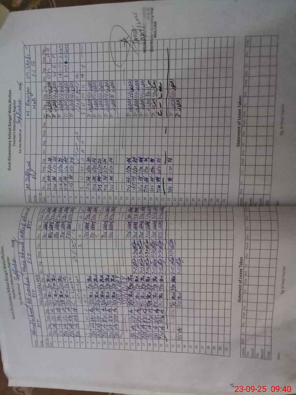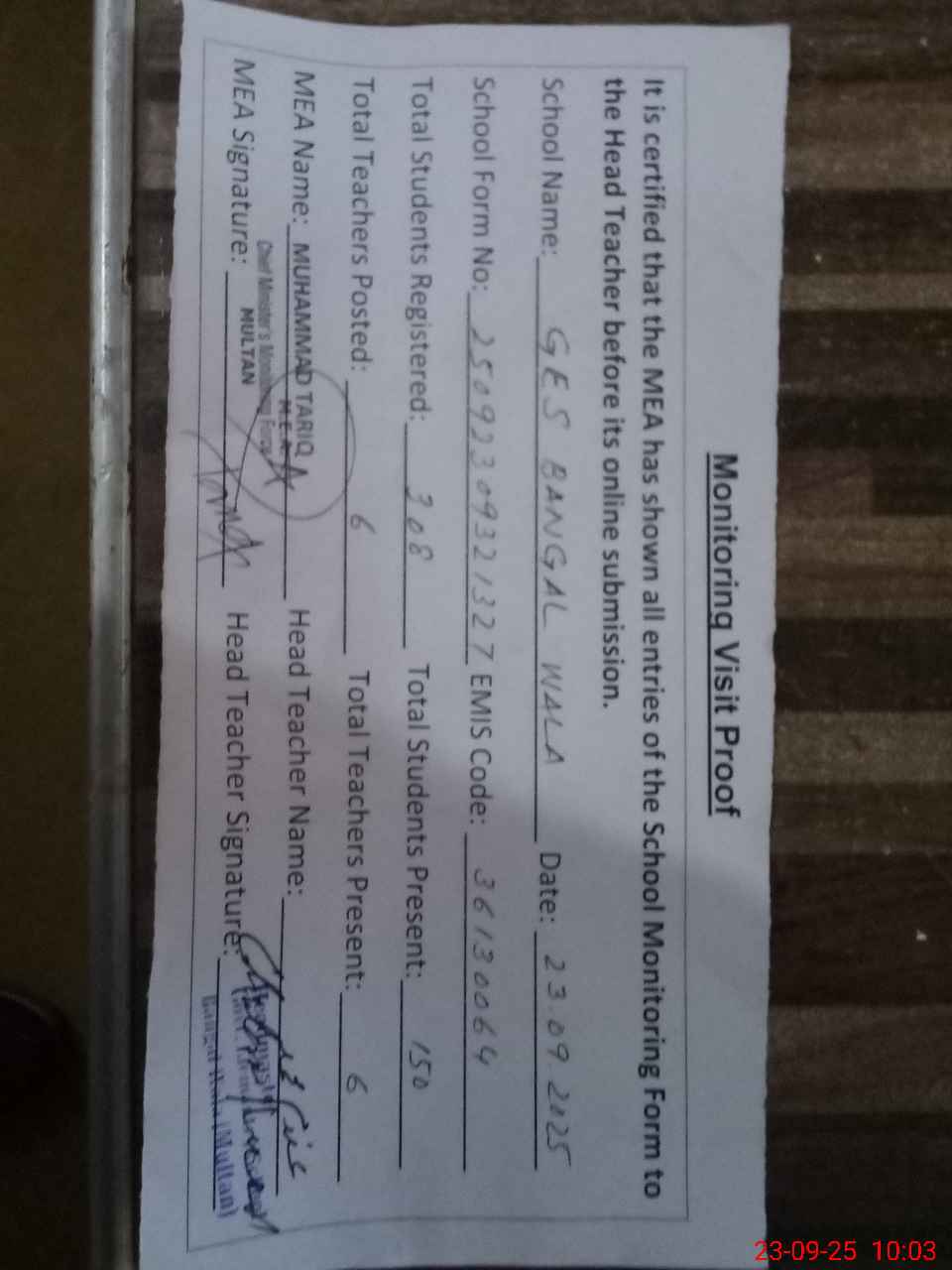 | Attendance Register | Head Teacher | MEA with School | Visit Proof |