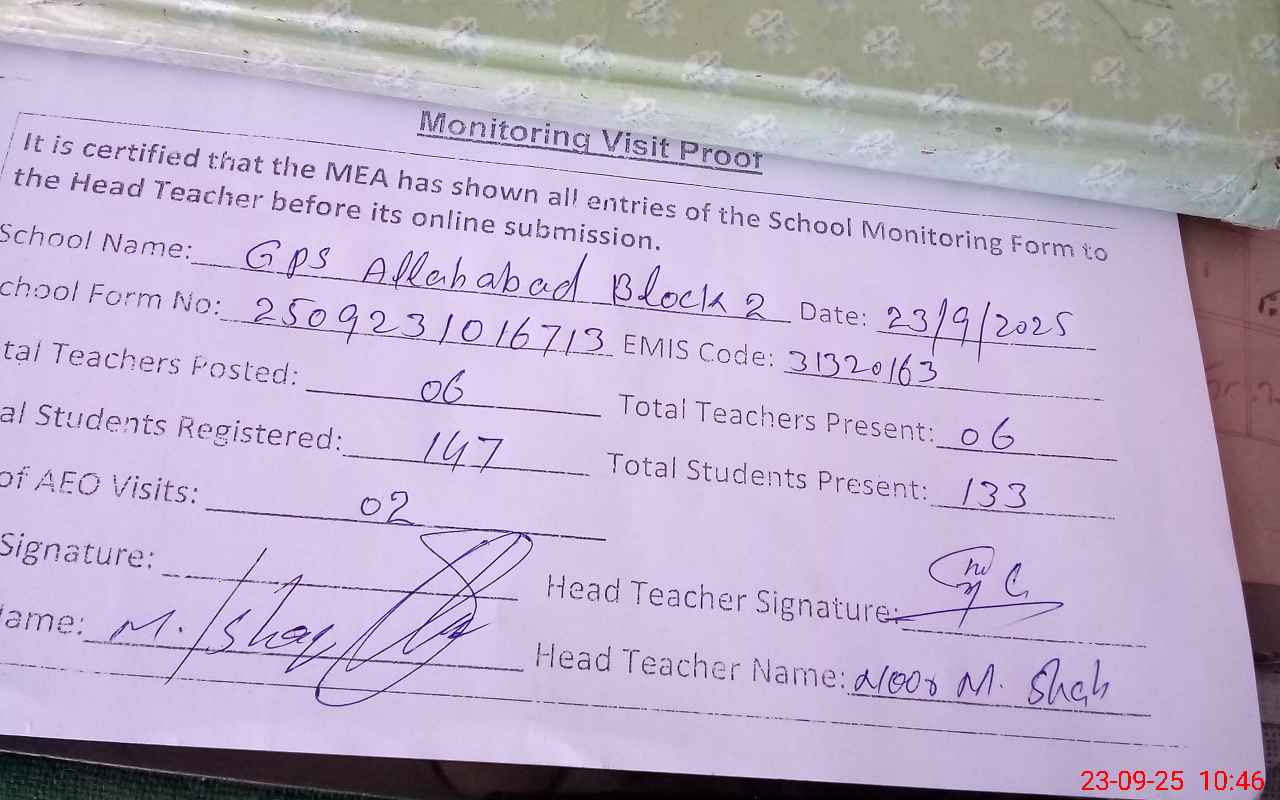 | EMIS Code: 31320163 | Name of School: GPS ALLAH ABAD BLOCK NO 2 | |||
