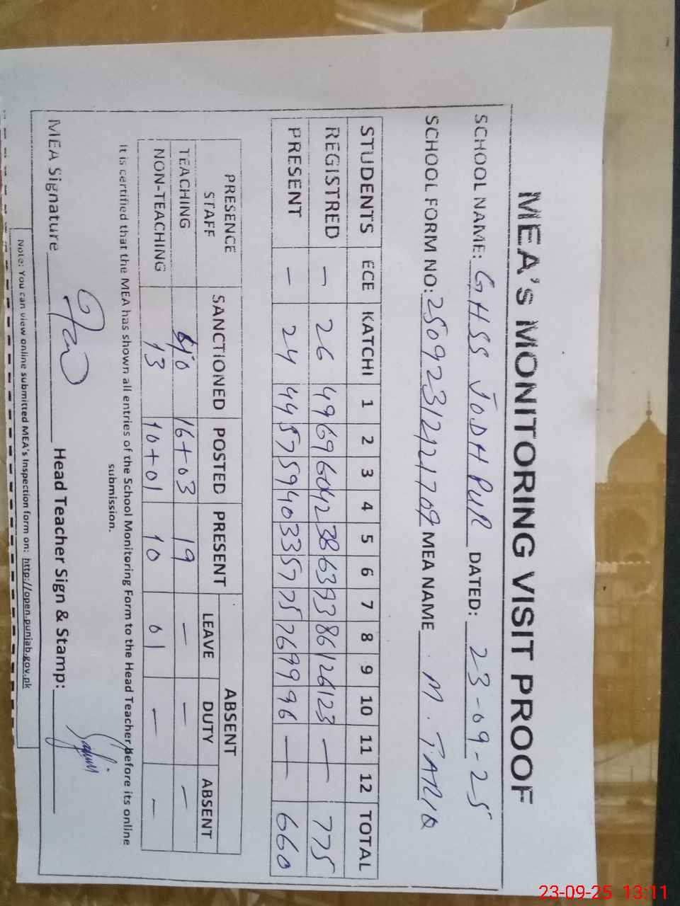 | Attendance Register | Head Teacher | MEA with School | Visit Proof |