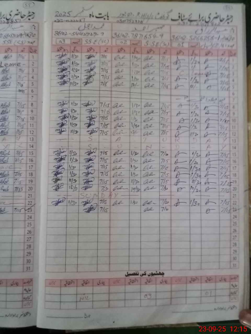 | CNIC | Full Name | Designation | R/C | Absence during last cal. month |
