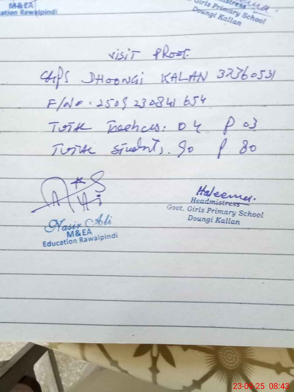 | Attendance Register | Head Teacher | MEA with School | Visit Proof |