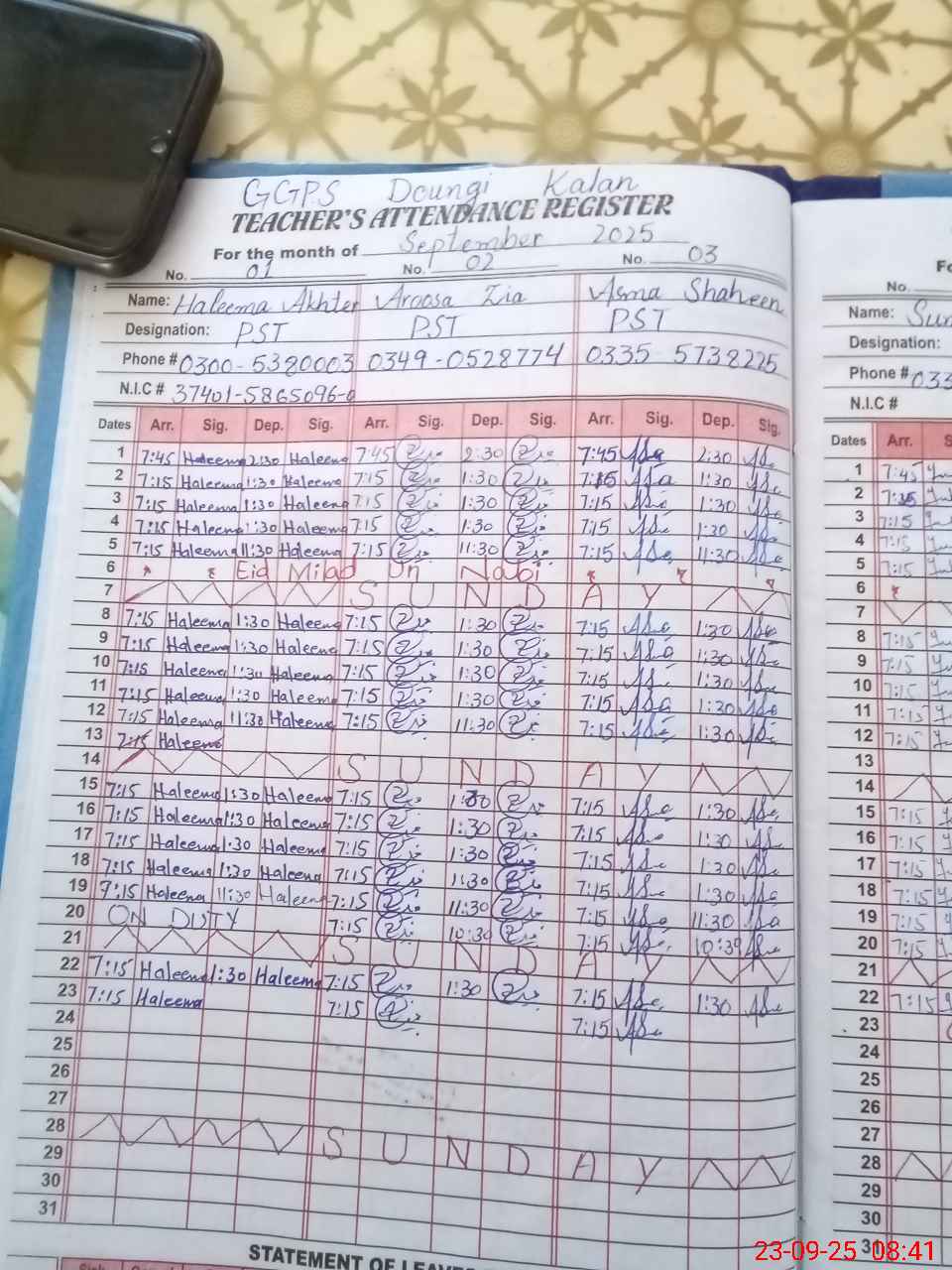 | CNIC | Full Name | Designation | R/C | Absence During Last Calender Month |