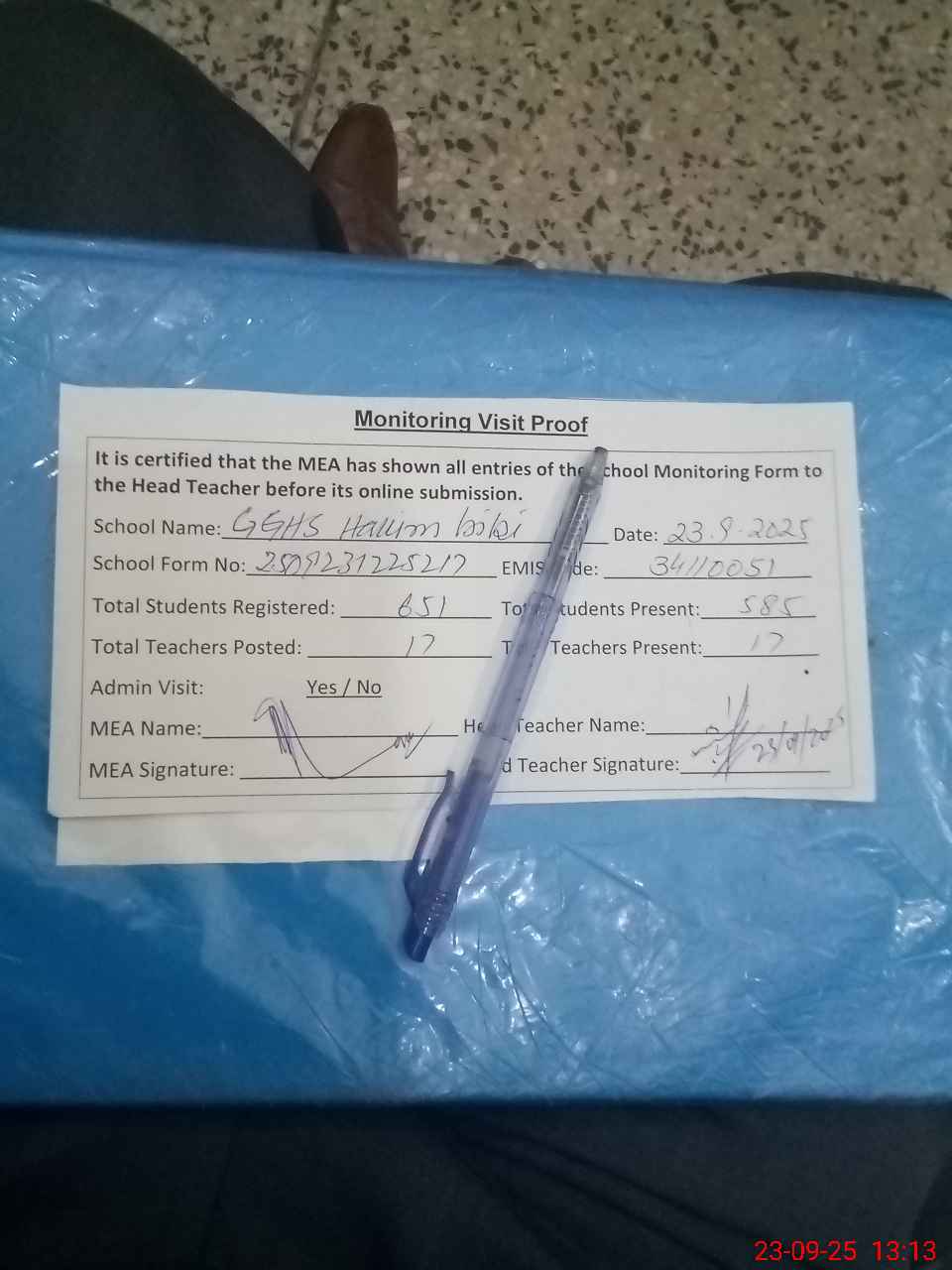 | Attendance Register | Head Teacher | MEA with School | Visit Proof |