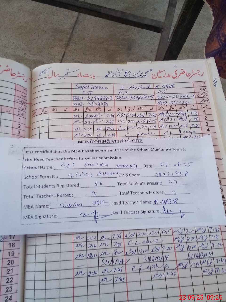 | Attendance Register | Head Teacher | MEA with School | Visit Proof |