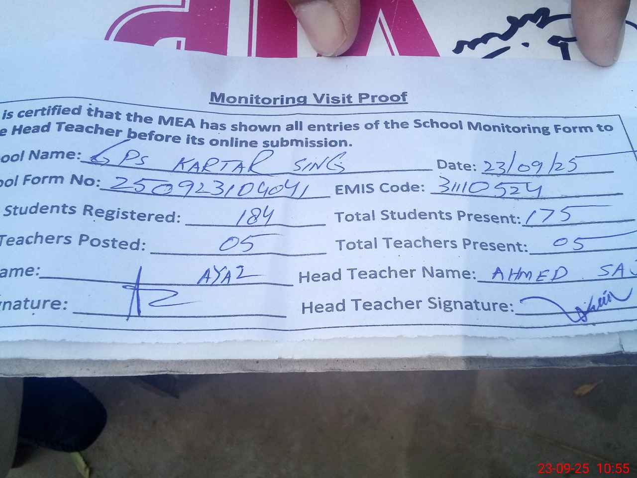 | Attendance Register | Head Teacher | MEA with School | Visit Proof |