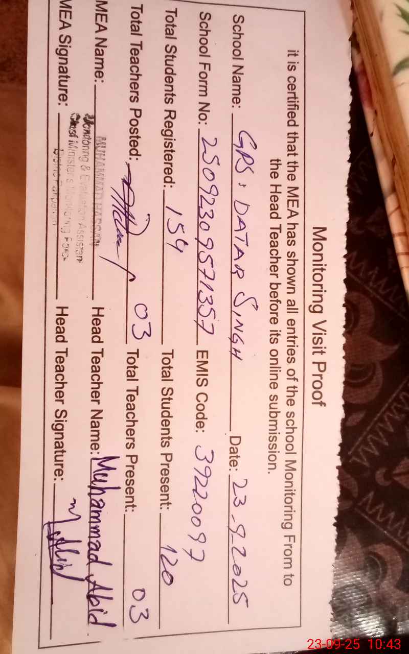 | EMIS Code: 39220097 | Name of School: GPS DATAR SINGH | |||