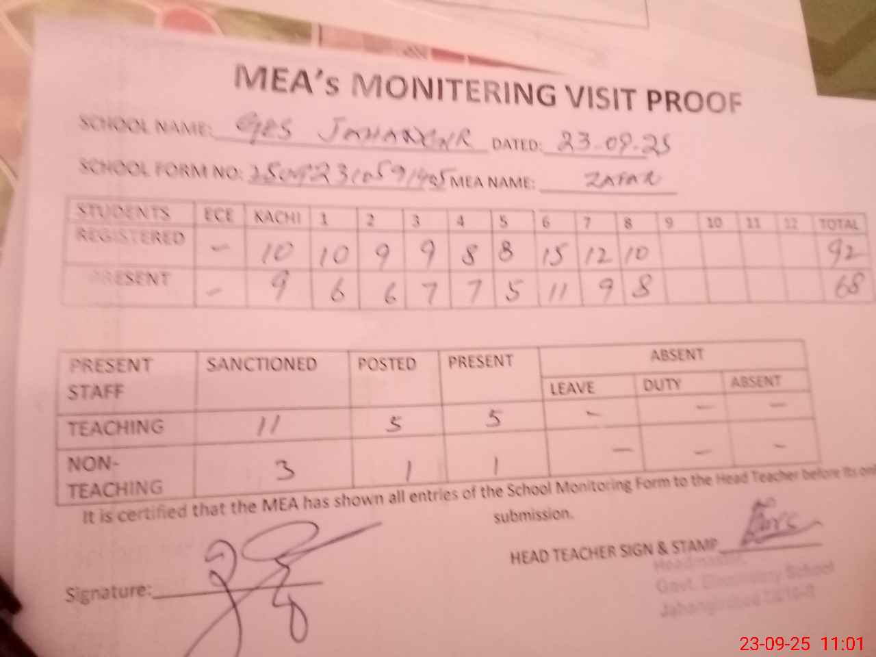 | Attendance Register | Head Teacher | MEA with School | Visit Proof |