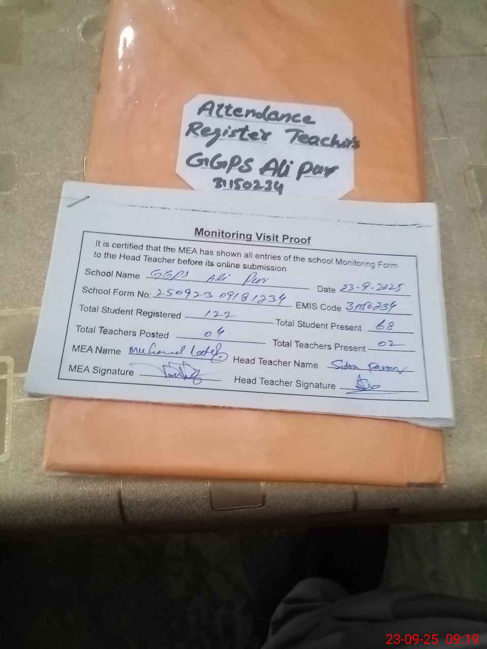 | Attendance Register | Head Teacher | MEA with School | Visit Proof |