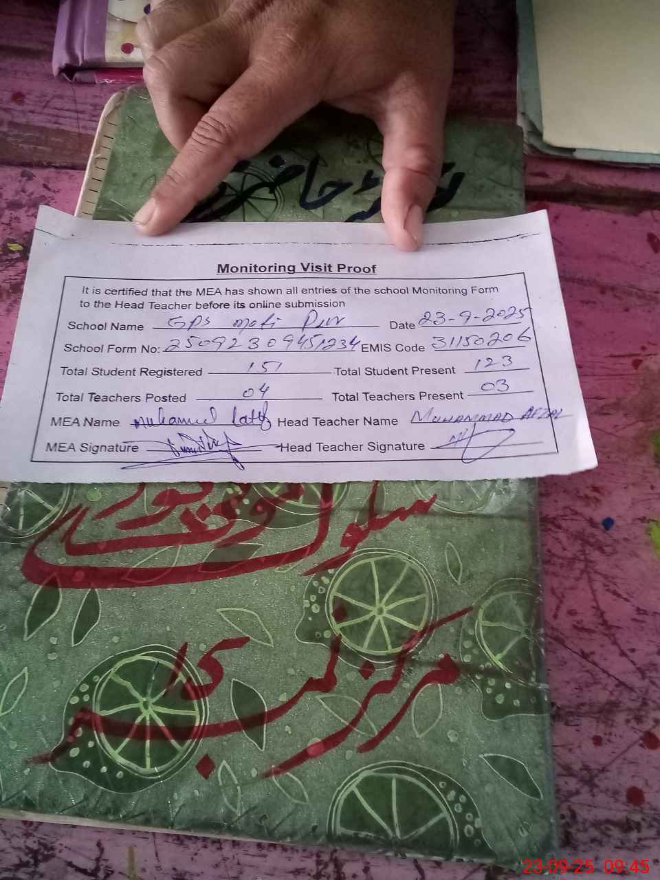 | Attendance Register | Head Teacher | MEA with School | Visit Proof |