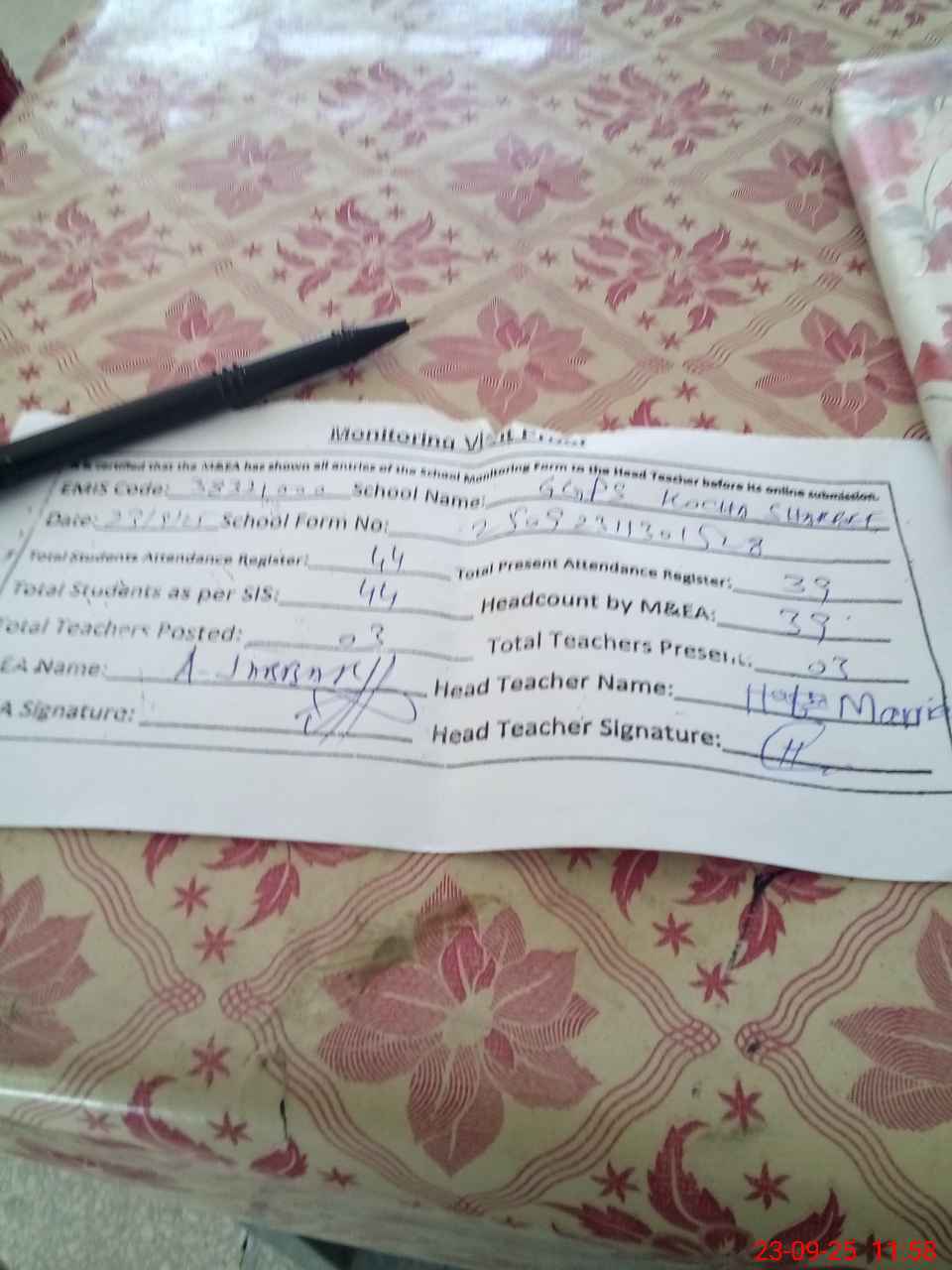| Attendance Register | Head Teacher | MEA with School | Visit Proof |