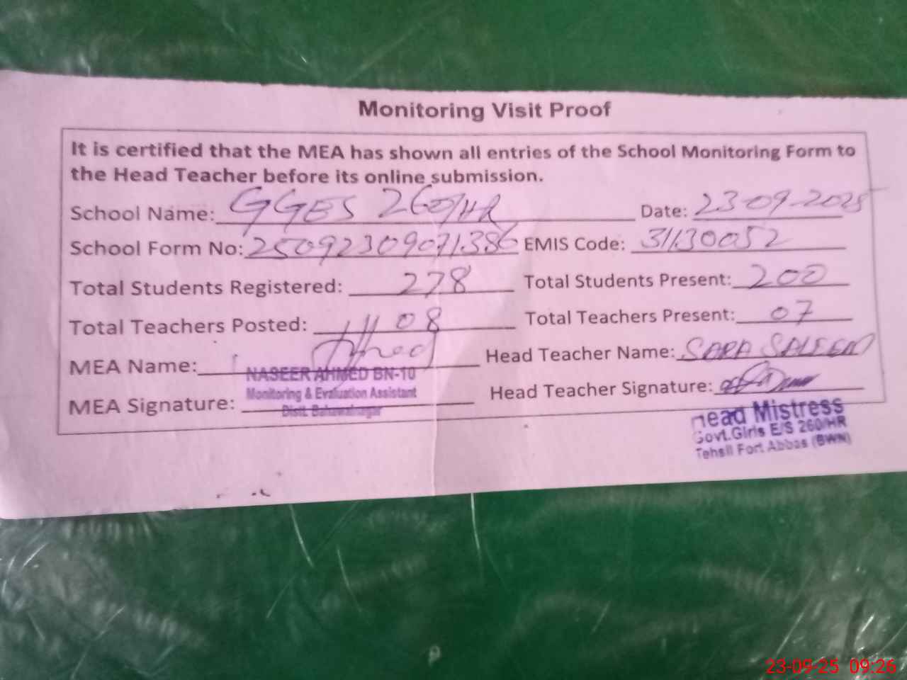 | Attendance Register | Head Teacher | MEA with School | Visit Proof |