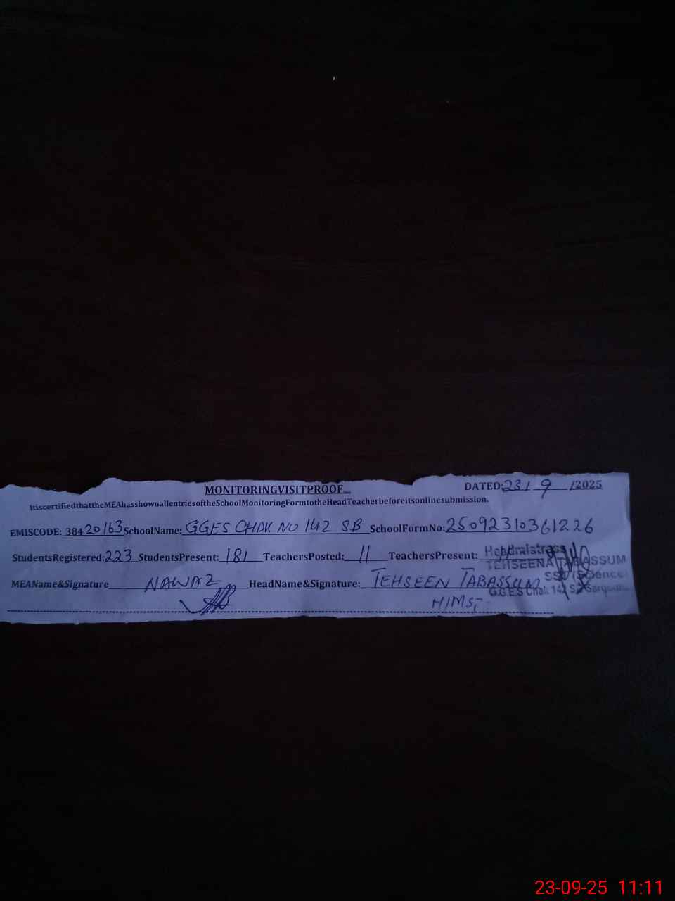 | Monitoring Date: 23-09-2025 | Start Time: 23-09-2025 10:36 AM | End Time: 23-09-2025 11:11 AM | Name of MEA: MU**** NA**** | |