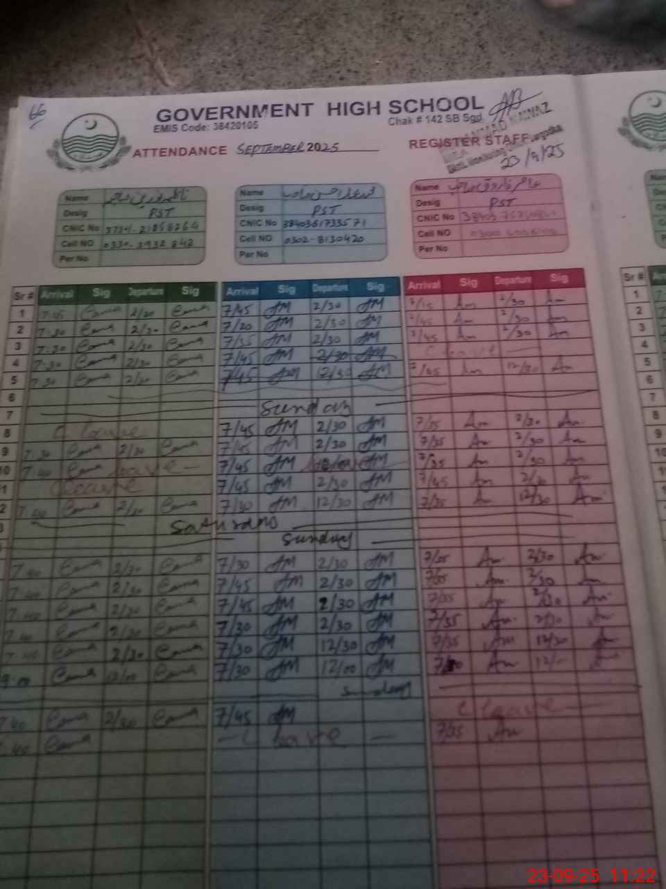 | CNIC | Full Name | Designation | R/C | Absence during last cal. month |