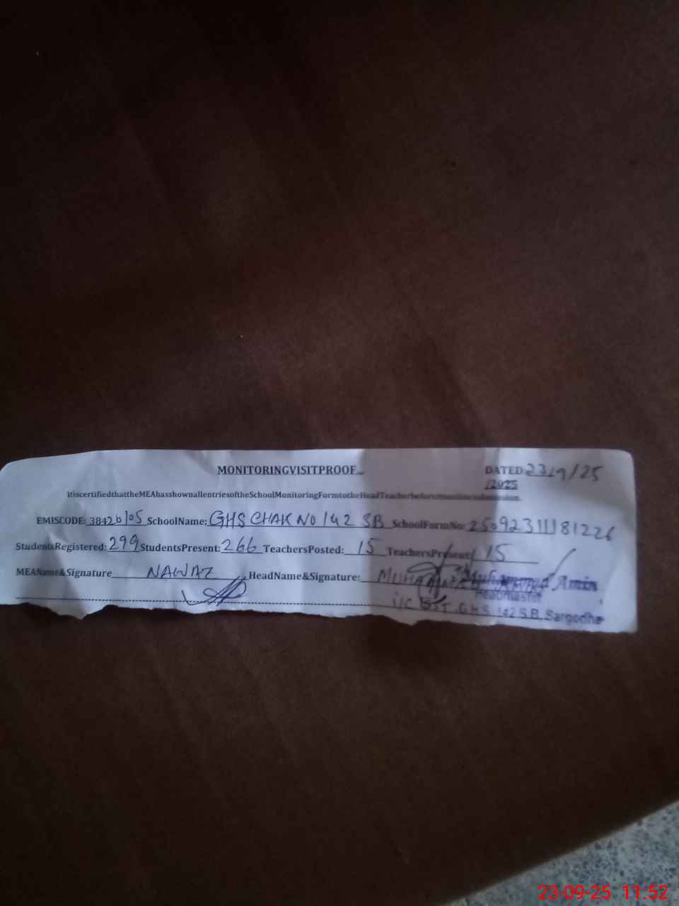 | Attendance Register | Head Teacher | MEA with School | Visit Proof |