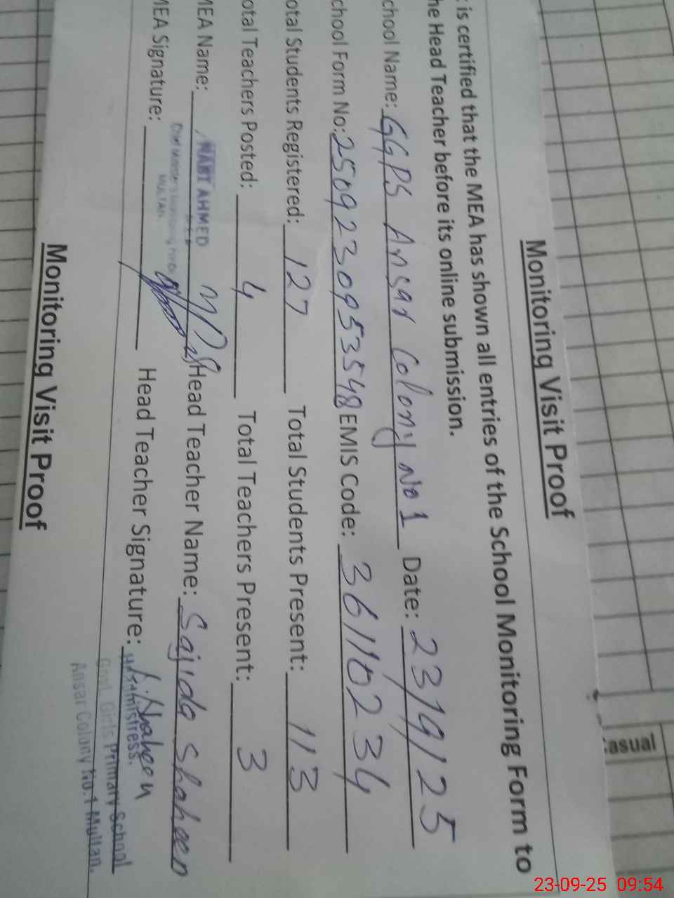 | Attendance Register | Head Teacher | MEA with School | Visit Proof |