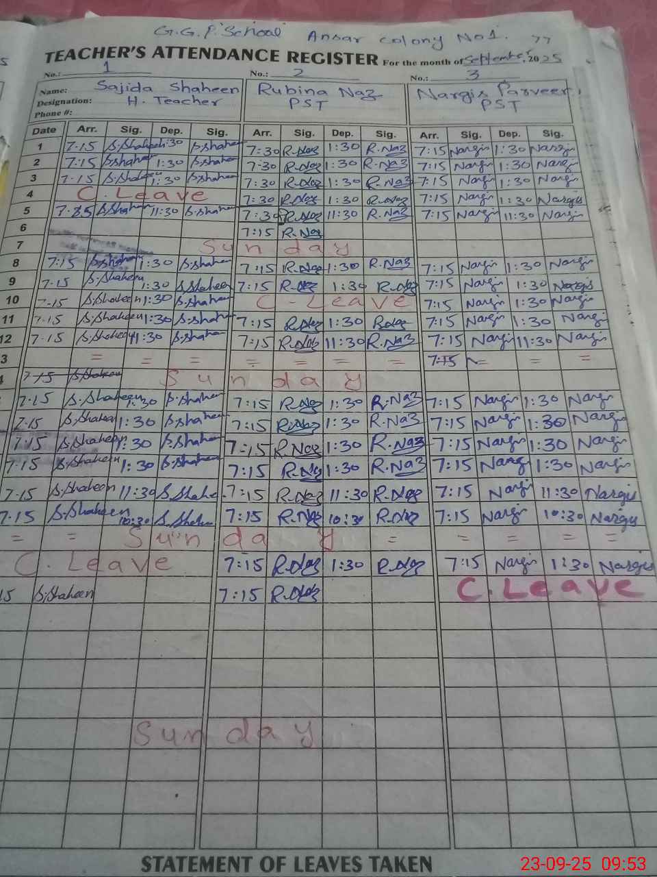 | CNIC | Full Name | Designation | R/C | Absence During Last Calender Month |