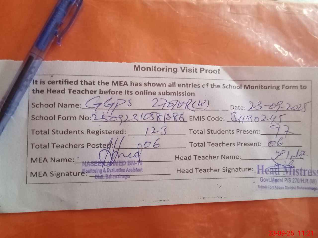 | EMIS Code: 31130245 | Name of School: GGPS CHAK NO. 270/HR-W | |||