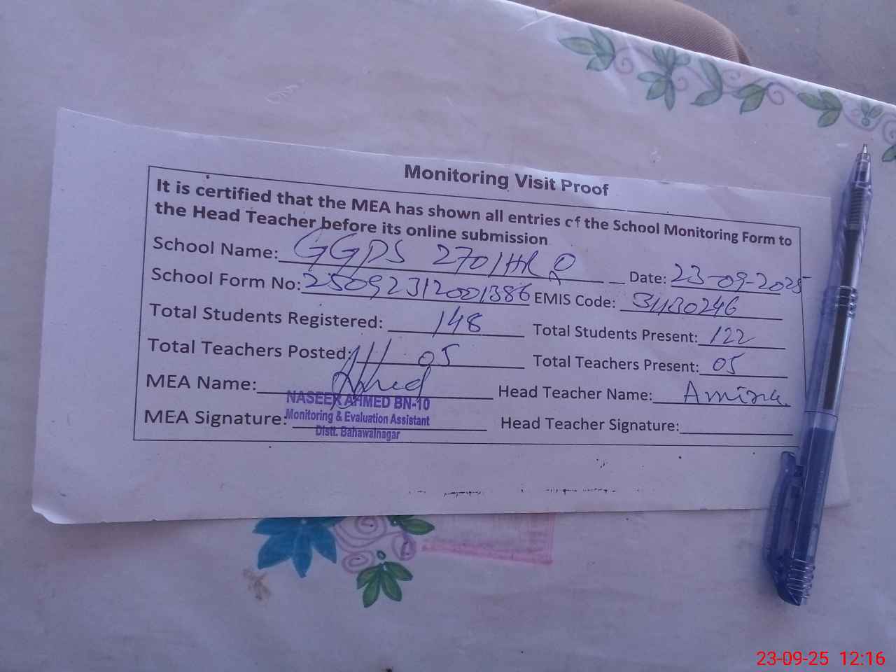 | EMIS Code: 31130246 | Name of School: GGPS CHAK NO. 270/HR-Q | |||