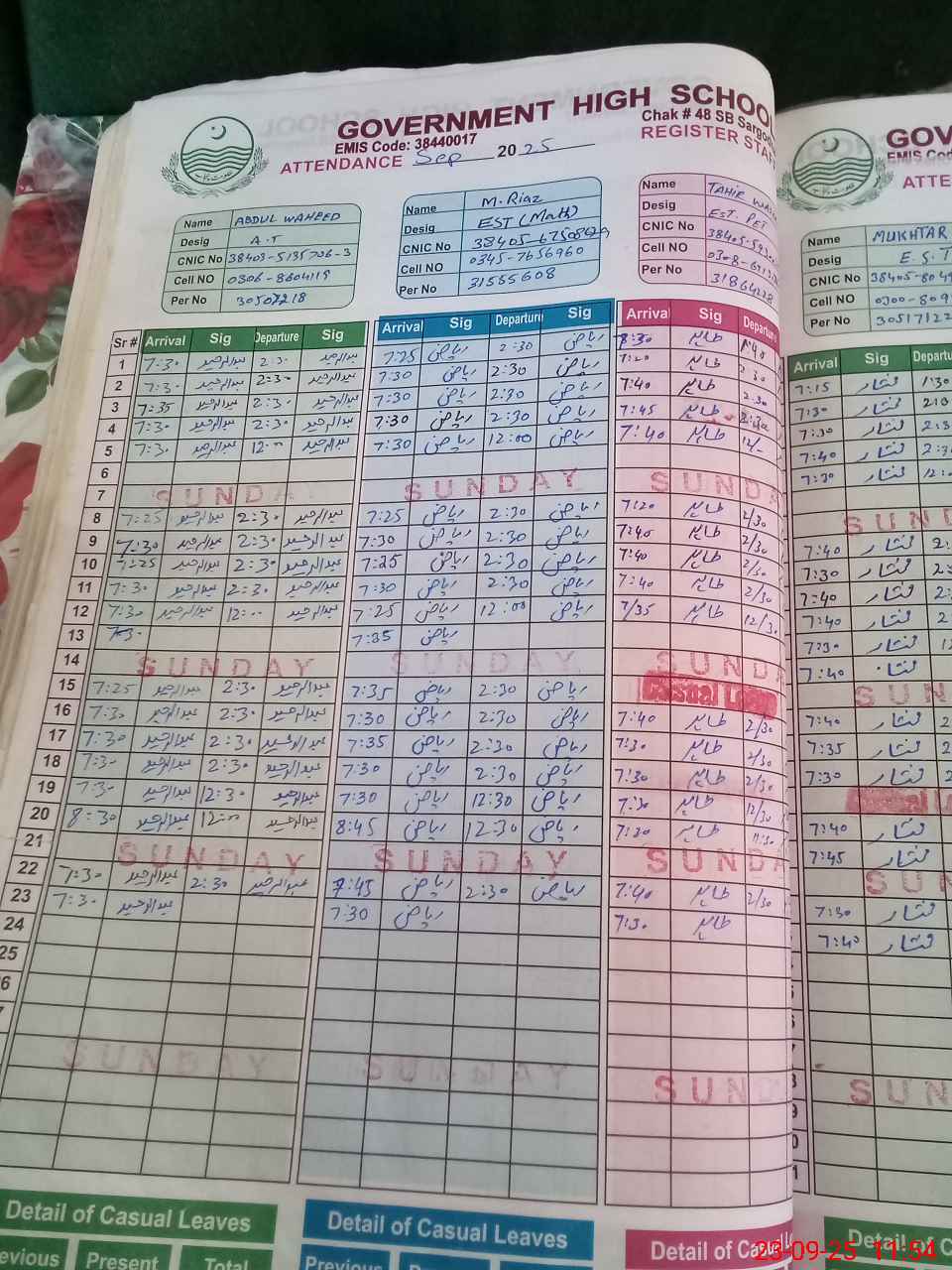 | CNIC | Full Name | Designation | R/C | Absence during last cal. month |