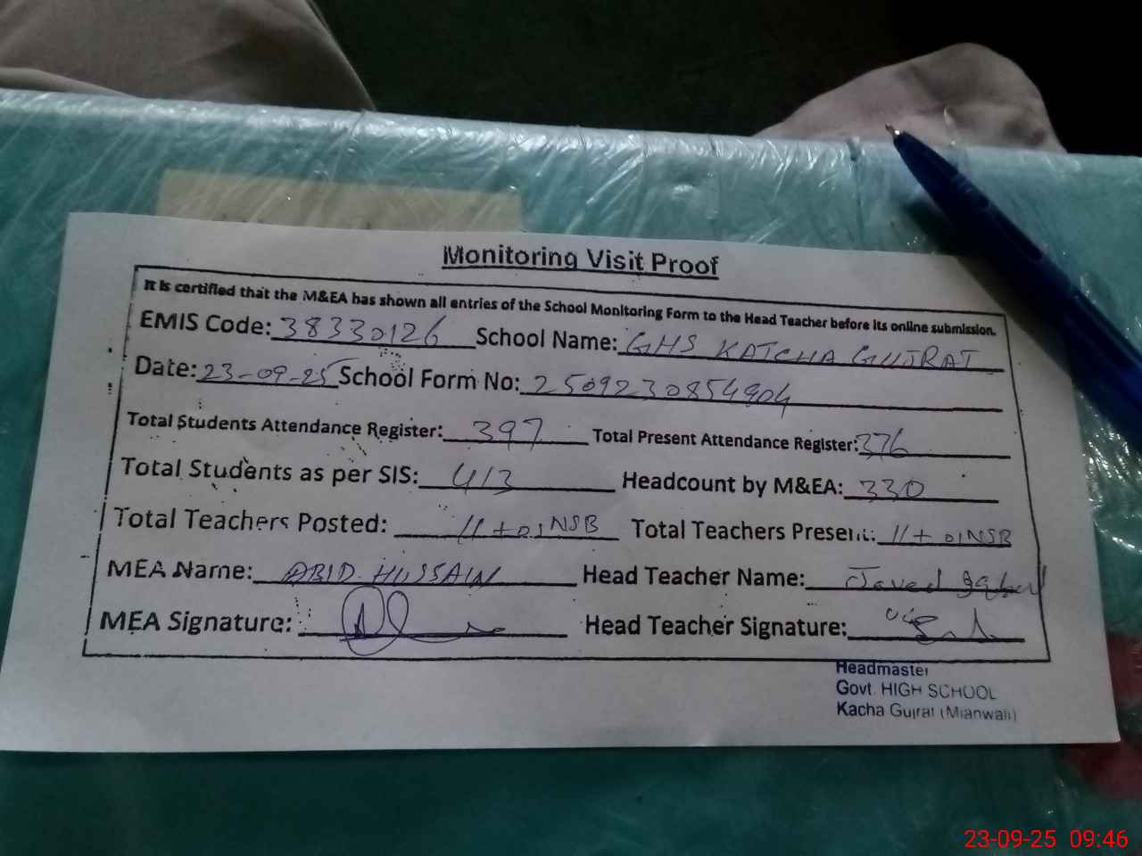 | Attendance Register | Head Teacher | MEA with School | Visit Proof |
