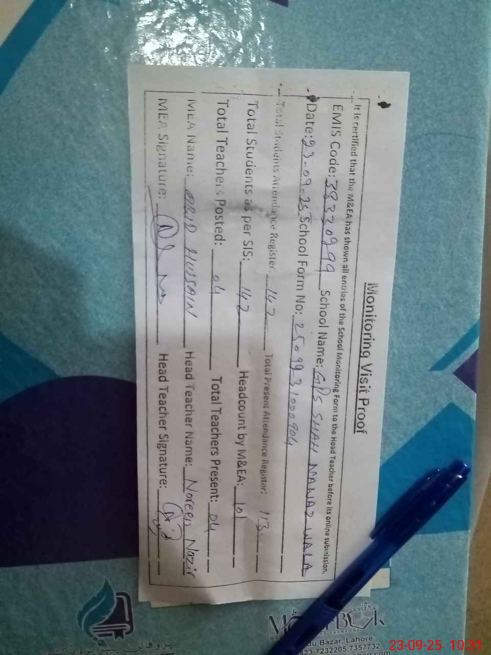 | Attendance Register | Head Teacher | MEA with School | Visit Proof |