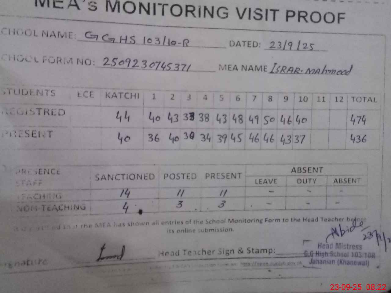 | Attendance Register | Head Teacher | MEA with School | Visit Proof |
