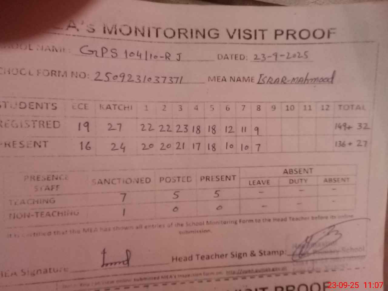 | Attendance Register | Head Teacher | MEA with School | Visit Proof |